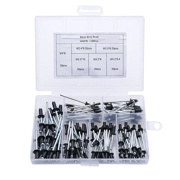 १२० पीसी रिवेट्स — यसमा ६ फरक साइजका ब्लाइन्ड रिवेट्स समावेश छन् (एलुमिनियम रिवेट हेड र एलोइ स्टील रिवेट कोर):