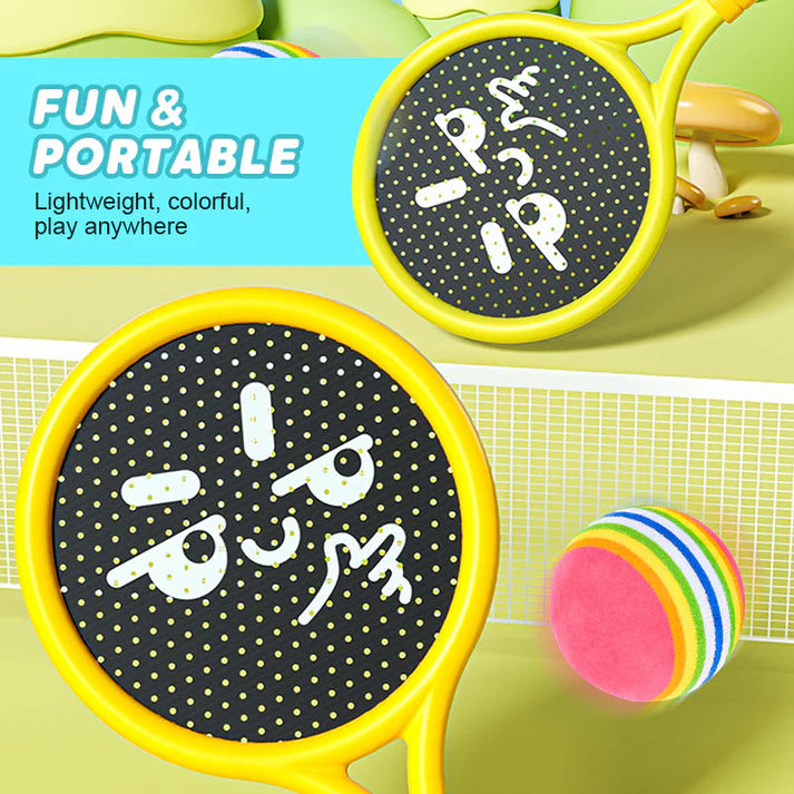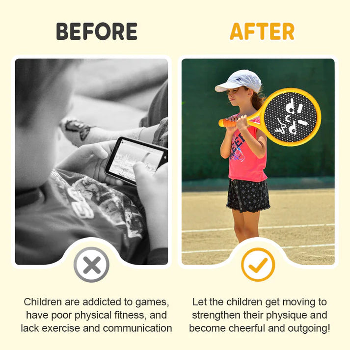 टिकाउ र सुरक्षित निर्माण: बालबालिकाका लागि सुरक्षित, उच्च गुणस्तरका सामग्रीबाट बनेको, जसले धक्का र खस्नबाट सुरक्षा गर्छ। थप बल र टिकाउपनका लागि त्रिकोणीय समर्थन संरचनाले मजबुत बनाइएको। चौडा र्याकेट फेसले सम्पर्क क्षेत्र बढाउँछ, जसले सफलता दर बढाउँछ।