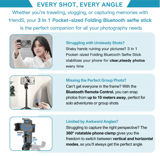 🌟Our selfie stick's got you covered!🥰Remote control means no more running to set the timer.🤳Tripod mode keeps shots steady for those envy-worthy group pics.