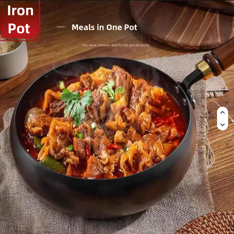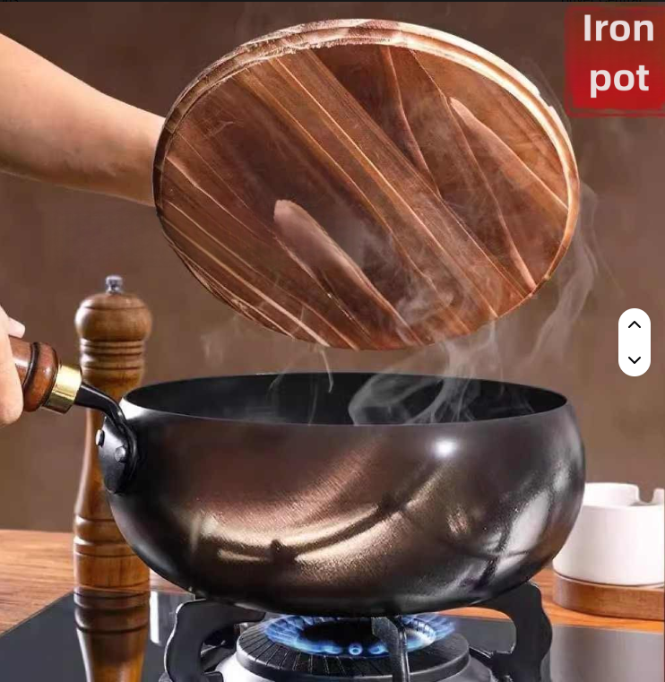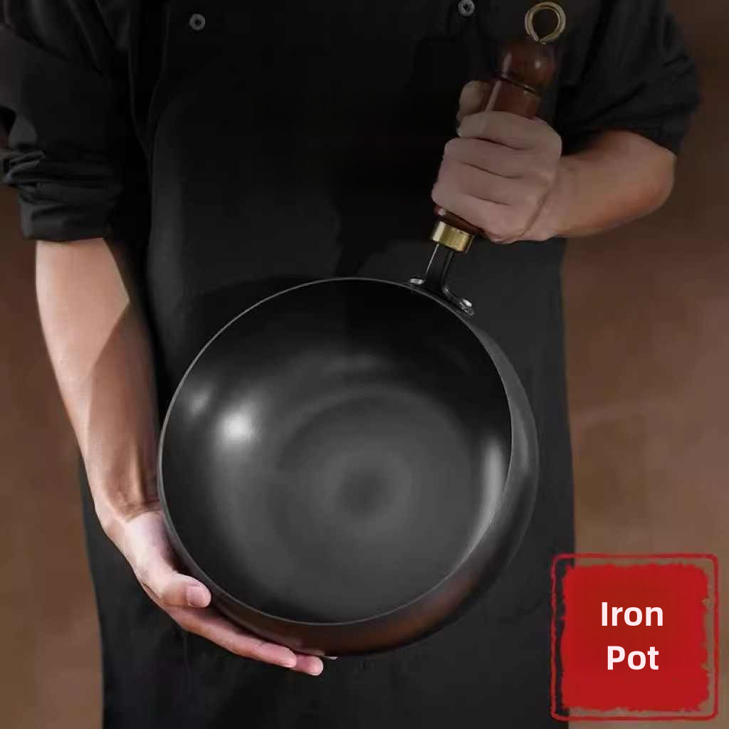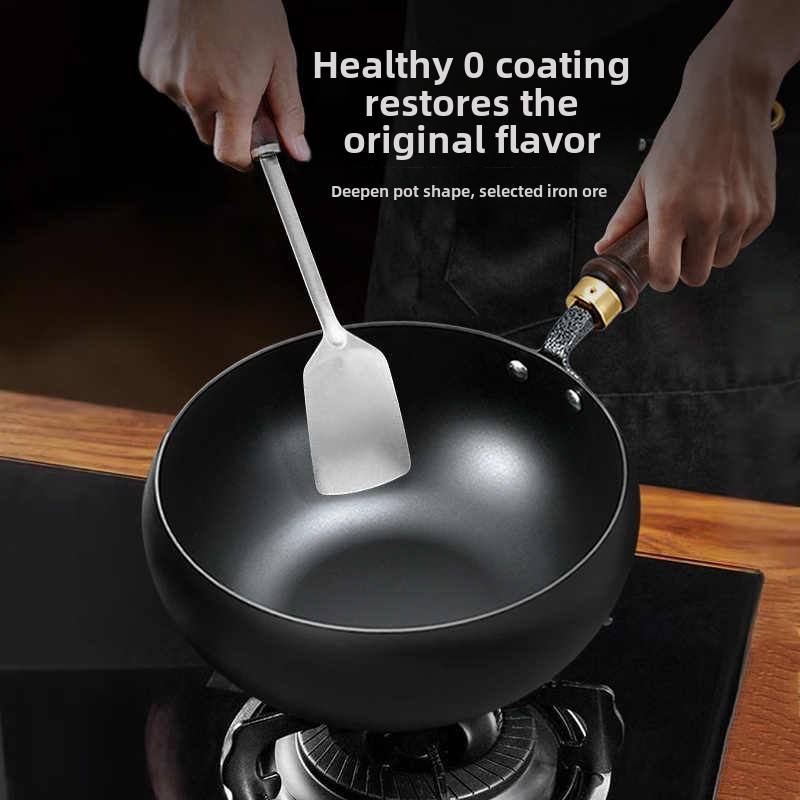 AMZ हिट बिक्री भान्सा हस्तनिर्मित फलामको फ्राइ प्यान – नन-कोटिङ, ठुलो वोक, काठको ह्याण्डलसहित
